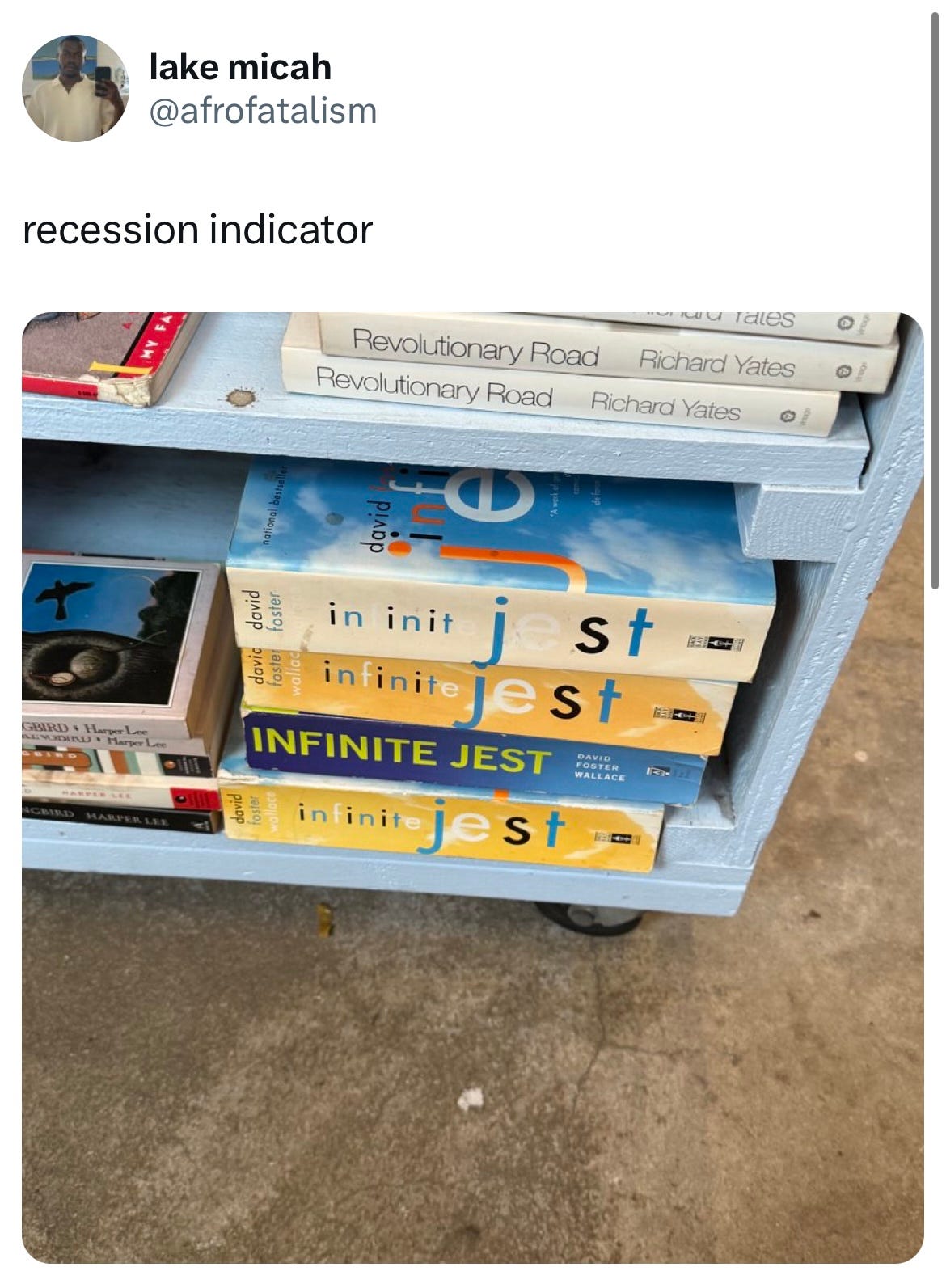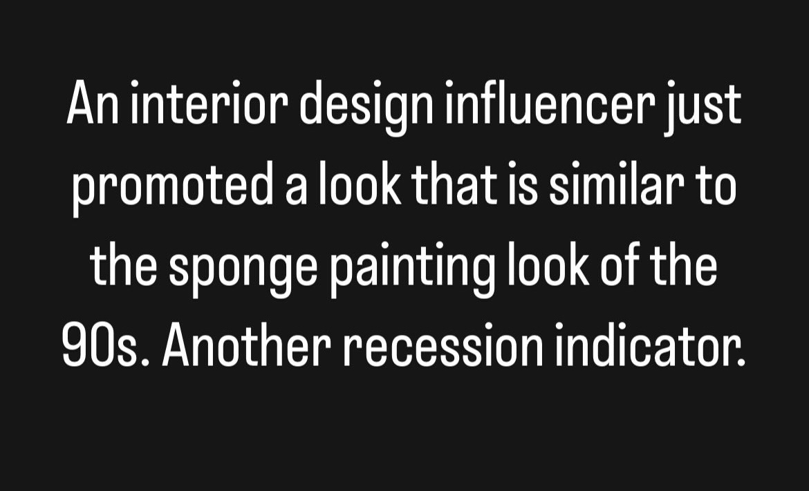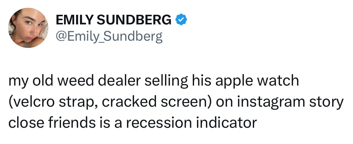 Recession indicator posts first appeared in 2023, remained steady throughout 2024, and reached a fever pitch halfway through 2025. Even the ones that aren’t obviously jokes are still more vibes than substance. Rather, they’re a desperate attempt to affirm our own perception and experience of the world as it slips further and further away from anything that could be deemed familiar. Widespread economic anxiety has become a steady feature of life. At the moment, almost everyone I know—I’m not friends with any billionaires—is experiencing some form of precarity, whether that’s long-term unemployment, a sharp decline in freelance gigs, or feeling stuck in a job they hate because of the dire state of the job market. People who can’t afford a $1000 emergency expense see recession indicators everywhere, the same way a Catholic sees Jesus in a piece of burnt toast.