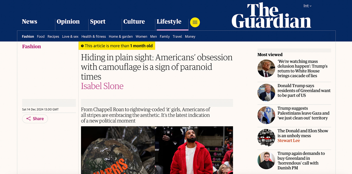 ICYMI, in December I wrote a story on the rise of RealTree hunting camo for the Guardian and how its popularity ties in directly to the upswing of populist politics in the US.